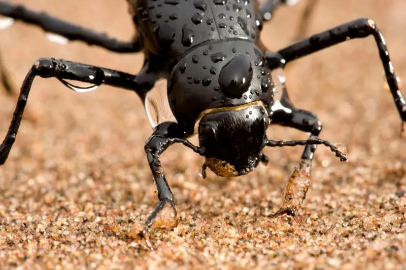 To do this, the beetle balances high up on a dune crest with its head lowered and stretches its rear part upwards to the wind as if it is doing a headstand. The mist condenses into small droplets and the water flows directly into its mouth via the grooves on its back.